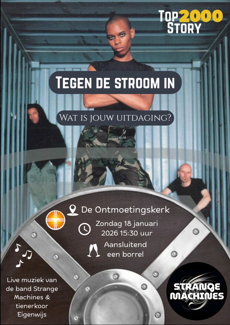 De 6-koppige band Strange Machines zal zo’n 12 nummers uit de Top2000 ten gehore brengen. En tussendoor zal er wat verteld worden. We hopen mensen tot nieuwe inzichten te brengen met het verhaal, dat aan de hand van al deze nummers wordt verteld, met als thema: “Tegen de stroom in.”